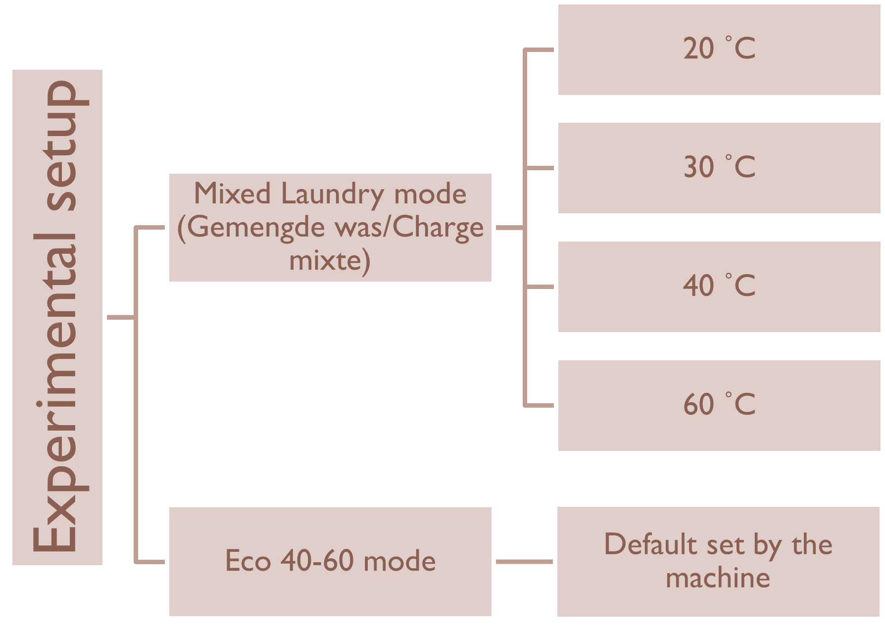 The washing machine has multiple modes for washing that can be selected for different cloth types and washing methods, as shown in the figure 1. Since each washing mode works differently and uses electricity in different ways, to control for this variability, the only washing mode that was used in this experiment was “Gemengde was/Charge Mixte”, which is Dutch/French for “Mixed laundry”, meant to handle different types of clothes in a single wash cycle. After selecting the Mixed laundry mode, it was possible to modify the set temperature of the water to be used during the washing cycle from 20°C to 90°C. Therefore, the parameters that were controllably changed were water temperature and the weight of the clothes. Additionally, one more washing mode was used, called “Eco 40-60” [11], which is ideally meant for saving energy and water consumption. More details on this the Eco 40-60 mode can be found in the section below. This experimental plan is illustrated in the figure 2.