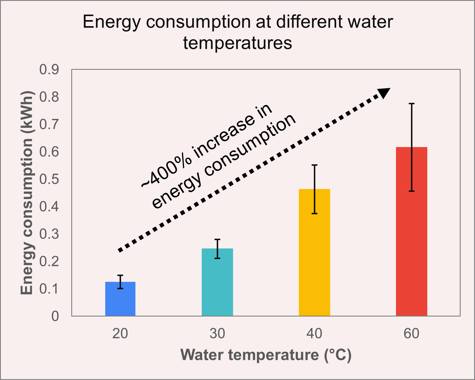 Figure 4: The graph shows the mean energy consumption per cycle (using the Mixed Laundry mode) with increase in the set water temperature used for that cycle. Each bar chart is a mean of at least 6 washing cycles (with variable laundry weight), and the error bars representing the standard deviation due to variation in the laundry weight.
