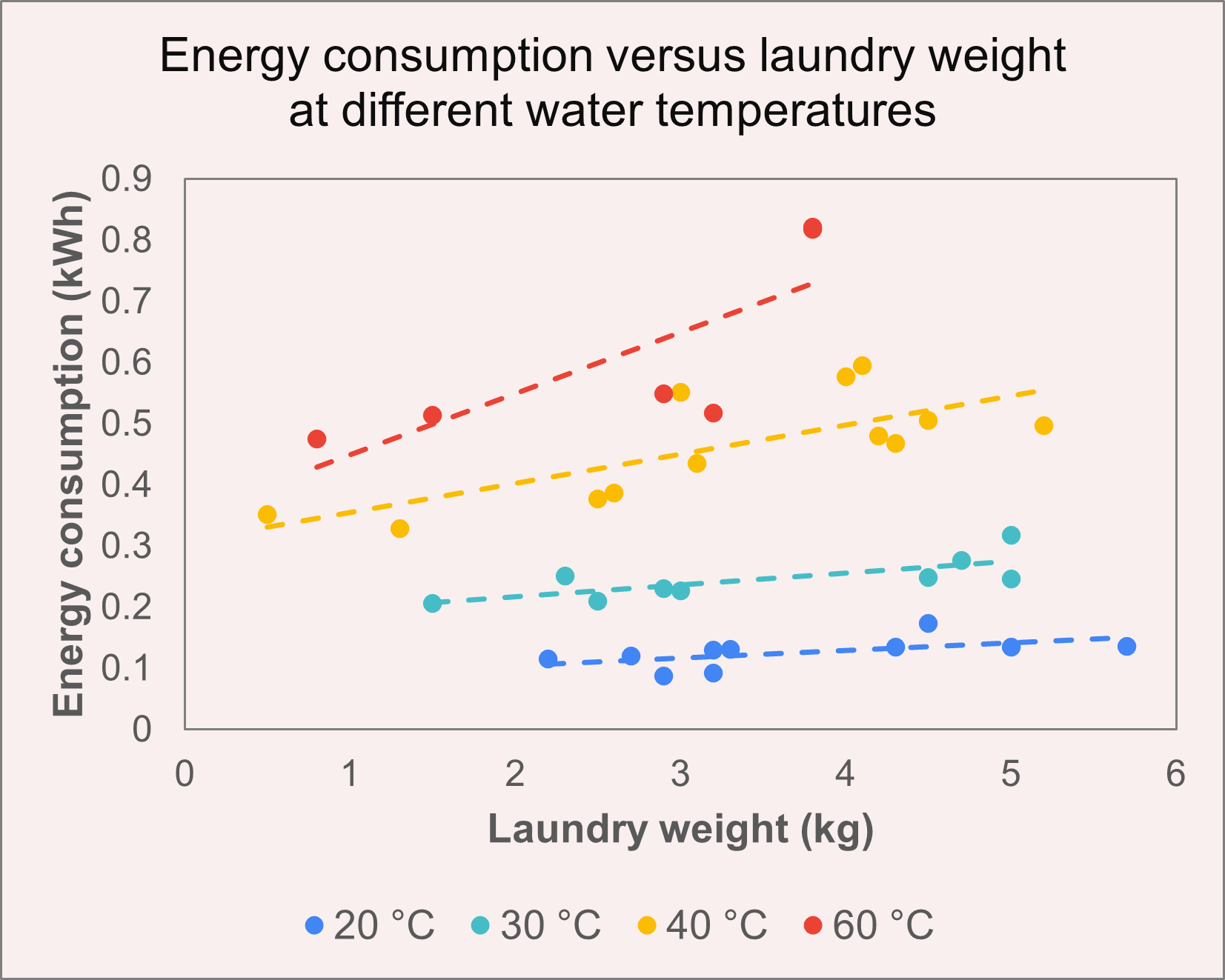 Figure 3: The graph shows the energy consumption per cycle with increase in laundry weight for each set water temperature used. Each dot represents 1 washing cycle. For lower water temperatures (20°C or 30°C), the laundry weight has negligible impact on the energy consumption, but when the washing cycle uses higher water temperature (40°C and 60°C), the energy consumption increases with increase in laundry weight. The dashed line represents a linear fit to the scatter plot for each temperature.